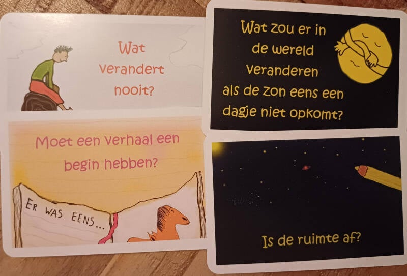 Hier boven staat een afbeelding van Praatprikkels. Wat staat er op het plaatje, wat kan je erover vertellen, komt dat overeen met de vraag die op het kaartje staat en wat vind je hiervan. Belangrijk is dat alles wat het kind zegt goed is. Deze kaartjes worden ook wel gebruikt om te filosoferen met kinderen. Gewoon samen praten of wat je ervan vind, wat het kind voelt bij de vraag die op het kaartje staat. Doorvragen en open vragen stellen is hierbij belangrijk. Dit is soms heel moeilijk, omdat we al snel iets voor een ander willen invullen of juist gesloten vragen stellen.